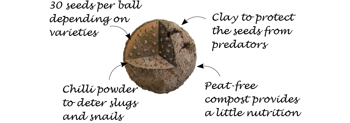 Wildflowers are naturally slow to germinate, and as such, loosely scattered seed can often be eaten by ants, birds and mice. We’ve helped to solve this problem by encasing the seed in a protective ball of clay, peat-free compost and chilli powder.